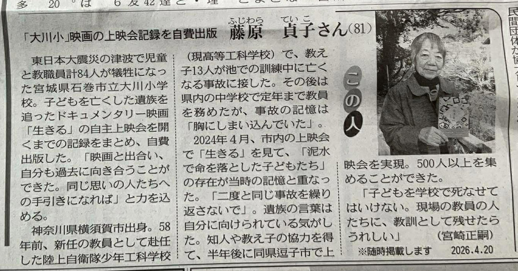 東日本大震災での宮城県石巻市、大川小学校の事故をドキュメンタリー映画にした『「生きる」大川小学校 津波裁判を闘った人たち』。