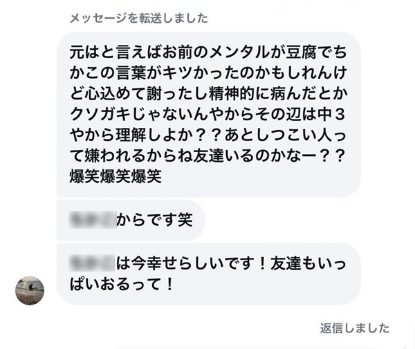 加害生徒とされるLINEメッセージには、「元はと言えばお前のメンタルが豆腐でちかこの言葉がキツかったのかもしれんけど」「あとシツコイ人って嫌われるからね友達いるのかなー??爆笑爆笑爆笑」「心込めて謝ったし精神的に病んだとかクソガキじゃないんやからその辺は中3やから理解しよか??」「◯◯◯(加害者の名前)は今幸せらしいです!友達もいっぱいおるって!」など自分の非を認めず、被害者を嘲笑し、侮辱する言葉が並んでおり、反省の色が全く見られない。