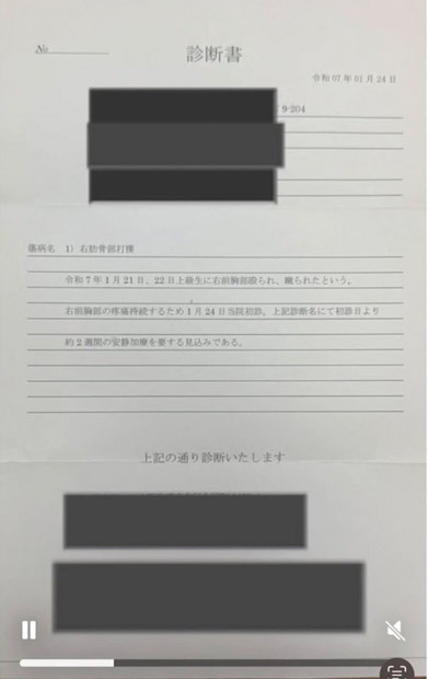 1月21日、Aさんは複数の先輩部員から殴る蹴るの暴行を受け、右肋骨部打撲で約2週間の安静加療を要する怪我を負った。