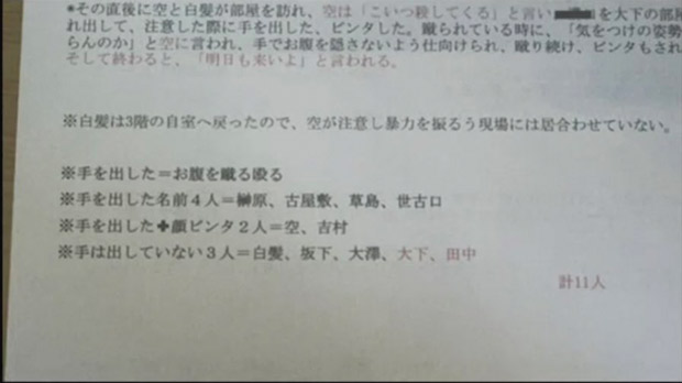 • 被害者は正座させられ、10人以上に囲まれて死ぬほど蹴られ、顔も殴られた。それを監督に相談したら「お前嘘はつくなよ」「2年生の対外試合なくなってもいいんか?」と逆に追い詰められた。