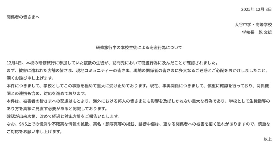 12月8日、大谷高校は公式サイトで《研修旅行中の本校生徒による窃盗行為について》という題名で文書を公開した。
