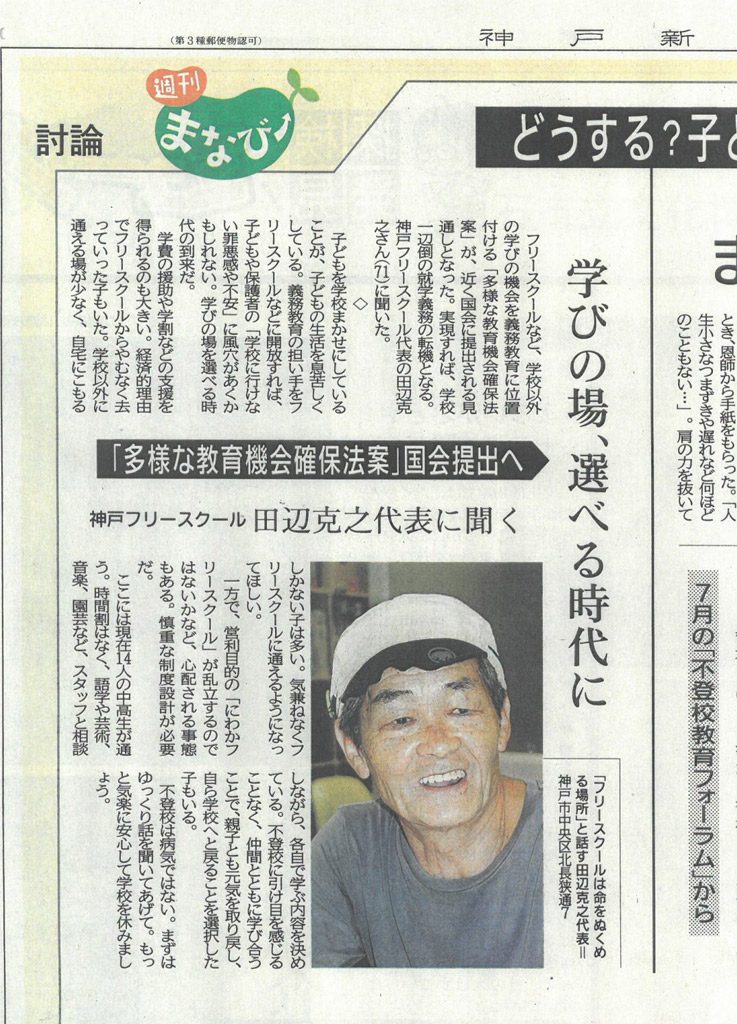 不登校の生徒とつきあって26年になるが、これはいつも古くて新しいテーマというか、20年前と同じ相談の電話がいまだに止まない。それほど市民が、文科省の「義務教育」という呪文に縛られているということであろう。学校だけが学びの場ではないと言える親がまだまだ少ない状況では、不登校生はいまだに肩身の狭いおもいですごさなければならない。いまやっと多様な学びを認め、フリースクールも学びの場として認可しようという機運が高まってきて、「多様な学び法案」的なものが国会でも議論されはじめている。しかしすべて教育委員会の監督下にあって満足な法案とは言いにくいが、フリースクールが国会でとりあげられるだけでも快挙というべきで、反対するものもいるが、もう一押しして、民間の学び場に光をあてる機会になればいいなと思う。
