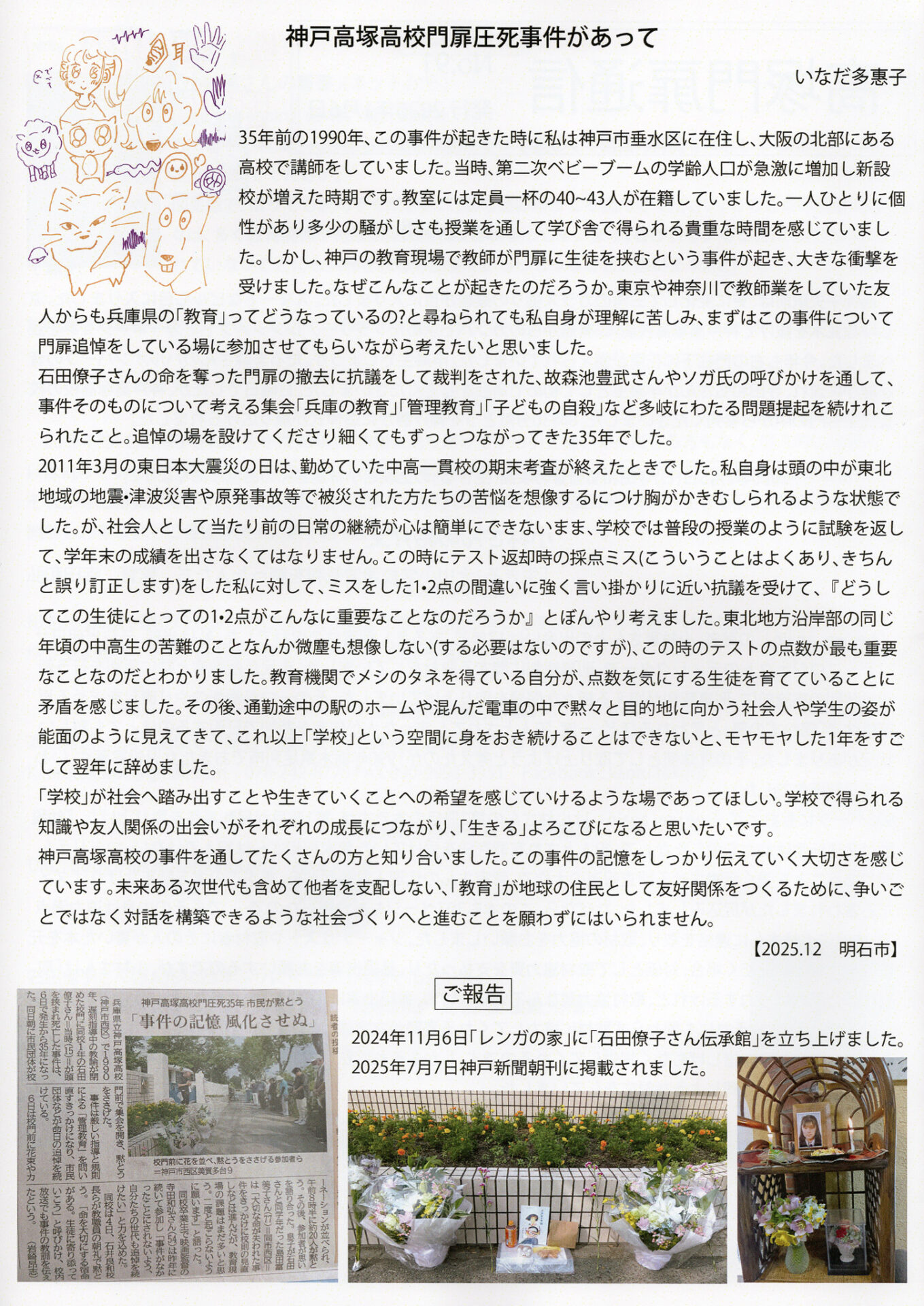 7月6日(月)AM8:30〜9:00『兵庫県立神戸高塚高校門前追悼』(西神中央駅徒歩10分)