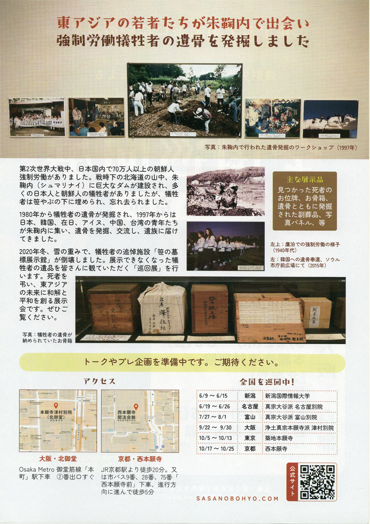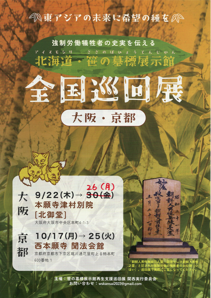 Home/政治/北海道・笹の墓標展示館 全国巡回展(大阪・京都) 政治 北海道・笹の墓標展示館 全国巡回展(大阪・京都) 2022年8月6日Last Updated: 2023年2月23日 186 Facebook X LinkedIn Pinterest Pocket Share via Email 「笹の墓標展示館」の再建費用の支援募金をお願いします。 >>強制労働犠牲者の史実を伝える 北海道・笹の墓標展示館 Tags強制労働 2022年8月6日Last Updated: 2023年2月23日 186 Facebook X LinkedIn Pinterest Pocket Share via Email 続きを読む 共有 Facebook X LinkedIn Pinterest Pocket Share via Email